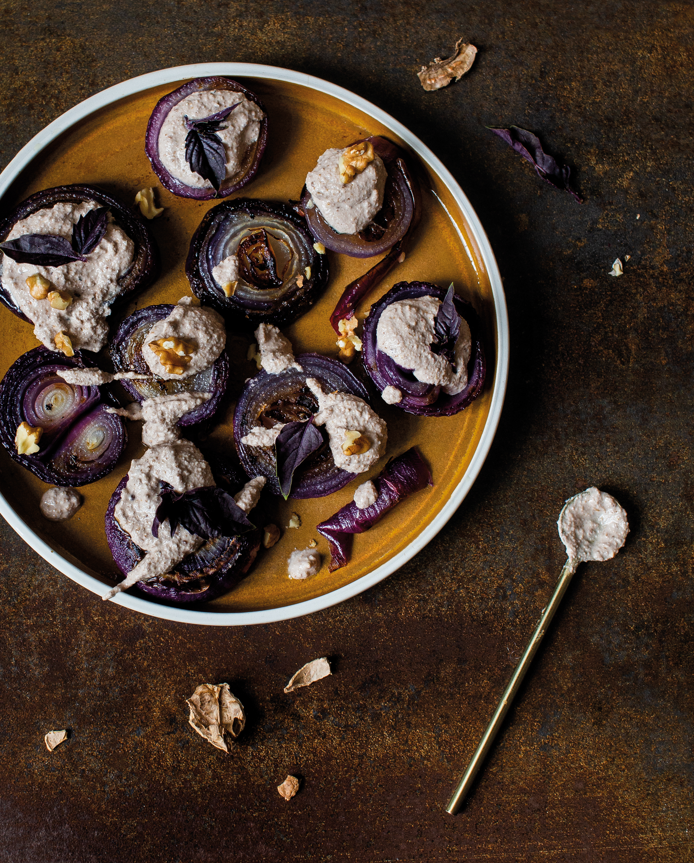 A hagymáknak levágjuk a tetejét és az alját, megpucoljuk, majd keresztbe három vastag, 1,5-2 centis szeletre szeljük őket. Alufóliázott tepsibe tesszük a karikákat, megöntözzük olajjal, sózzuk, borsozzuk, majd 200 fokon kb. 20 perc alatt aranybarnára sütjük őket. Ezalatt egy turmixgépbe tesszük a diót, fokhagymát, ecetet és a fűszereket majd turmixolás közben folyamatosan adagoljuk hozzá a vizet, hogy egységes állagú krémet kapjunk. Tálaláskor a hagyma szeletekre kanalazzuk a diókrémet, megszórjuk chilivel és a petrezselyemlevelekkel.
