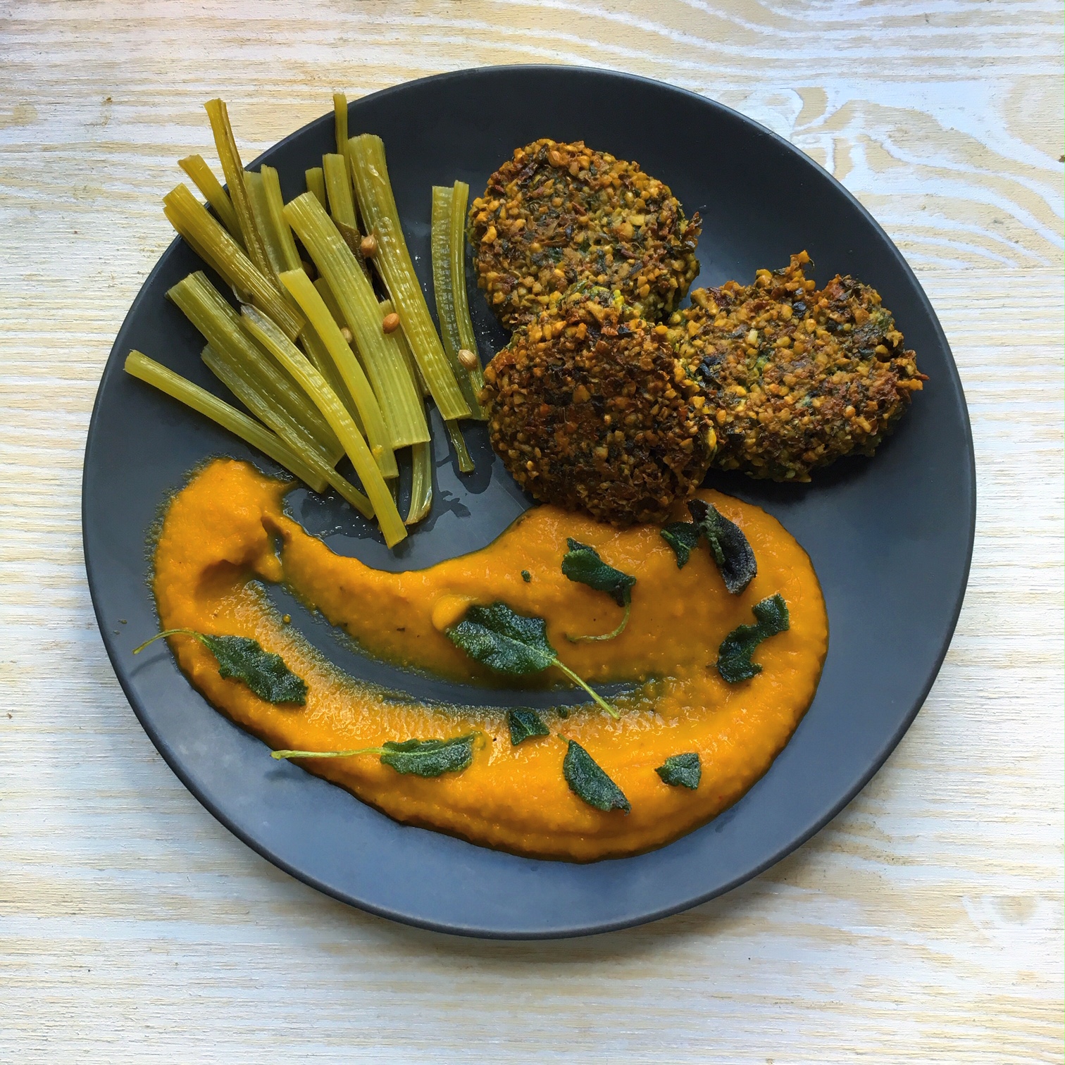 Mivel egy szép nagy csokorral érkezett a Szatyorboltos csomagomban, falafel és pácolt mángoldszár lett belőle. A páclében visszaköszön a koriandermag, így alkotnak harmonikus egységet a falafellel. Sütőtökpürével igazán ősz indító fogás is.