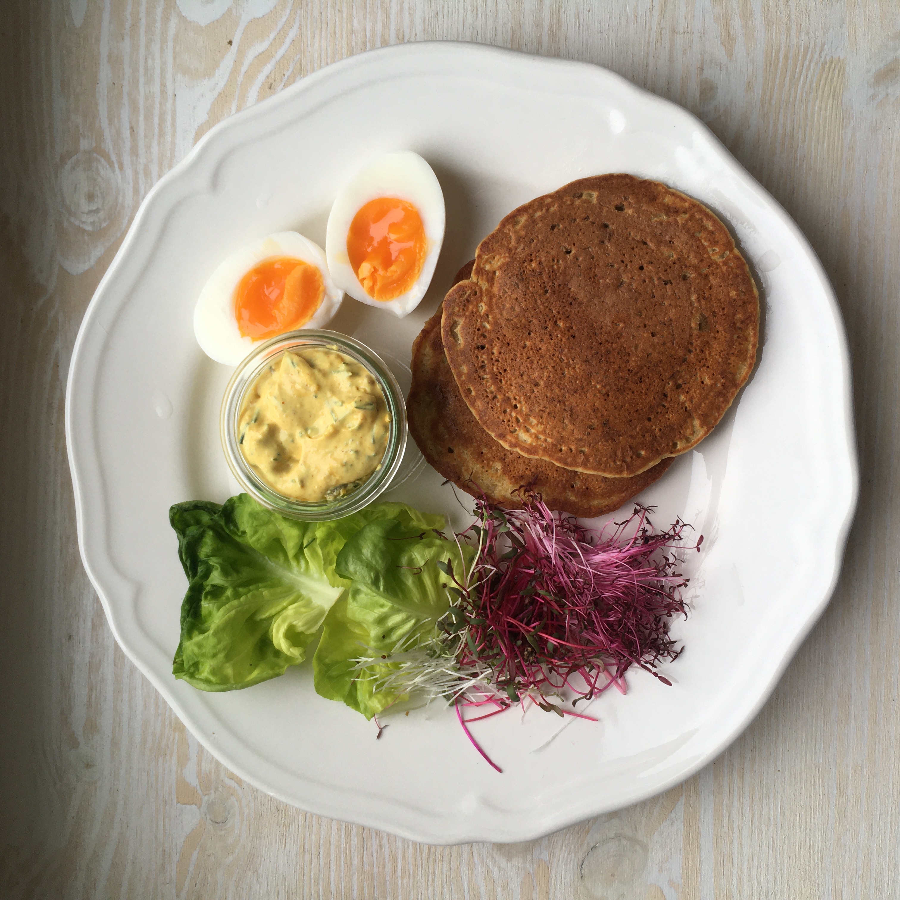 [1] Egy serpenyőben felmelegítjük a 2 evőkanál olajat, rádobjuk a gyömbért, a fokhagymát, a csilit és az újhagymát majd 6 perc alatt megpirítjuk őket. Félretesszük hűlni. [2] Eközben egy nagy edényben összekeverjük a liszteket a sóval, sütőporral, szénsavas vízzel, ecettel, római kömyénnyel és a garam masalával. 15 percig állni hagyjuk, hogy az ízek összeérjenek, majd a kihűlt pirított gyömbéres keveréket is hozzákeverjük. [3] Egy tapadásmentes palacsintasütőt felforrósítunk, fél evőkanál olajjal megkenjük, majd egy merőkanálnyi tésztát öntönk bele (kb. 80 gr). Oldalanként kb. 2 perc alatt aranybarnára sütjük, pufinak kell lenniük, mint egy amerikai palacsintának. [4] Tálaláskor a joghurtot a mangó savanyúsággal egy tálkában elkeverjük, a palacsintához ezt a szószt, friss tavaszi zöldeket (salátát, mikrozöldeket) és 7-8 perces tojást adunk.
