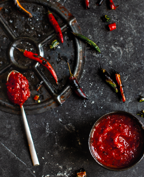(1) A gázrózsa alá körben alufóliát teszünk, majd ráhelyezünk egy lángelosztót, és ráteszünk három-négy csilit. Minden oldalán és az alján is feketére égetjük (kb. 5 perc alatt kész). (2) Közben kivágjuk a többi csili csumáját, a paprikákat elvágjuk, és eltávolítjuk a magokat és ereket. A műveletet a megsült paprikákkal is elvégezzük. Mérlegen mérjük le a paprikát, és számítsuk ki a szükséges só mennyiségét (2%). (3) A paprikákat, a kimért sót, a cukrot és a fokhagymát aprítógépben összeaprítjuk. (4) A keveréket alaposan kimosott befőttesüvegbe öntjük. Az üveg akkora legyen, hogy egészen a tetejéig meg tudjuk tölteni a keverékkel, így nem marad hely benne levegőnek. Konyhapulton hagyva 5 nap alatt fermentálódik (ebben a melegben lehet, hogy ez is gyorsabban készül). (5) Ezután turmixgépbe tesszük és összedolgozzuk az ecettel, amíg sima állagú nem lesz.